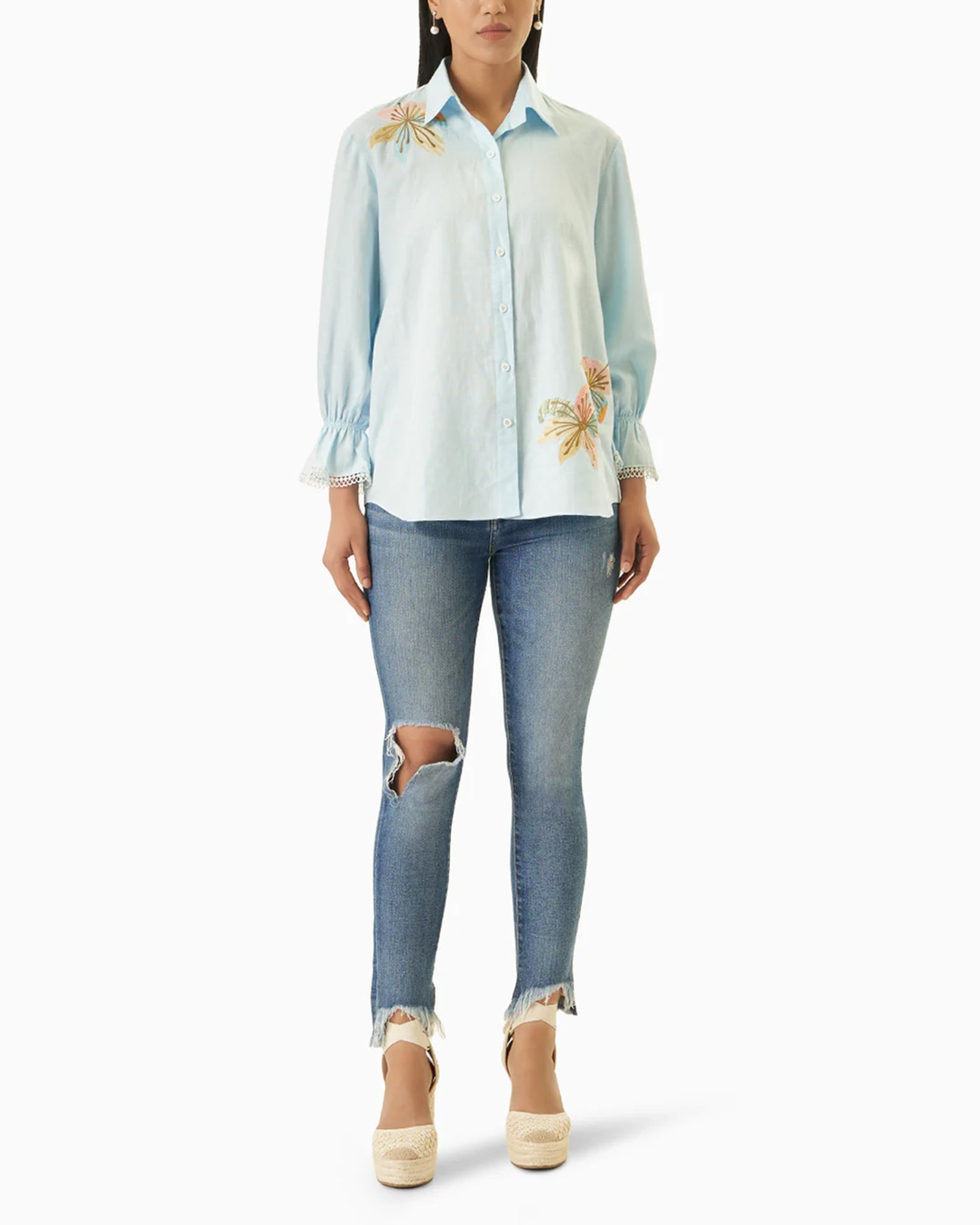 Introducing our Blossom Shirt, meticulously crafted from a blend of cotton and linen for optimal comfort and breathability. This straight-fit shirt boasts exquisite appliqué embroidery, adding a touch of sophistication and charm to your wardrobe.
