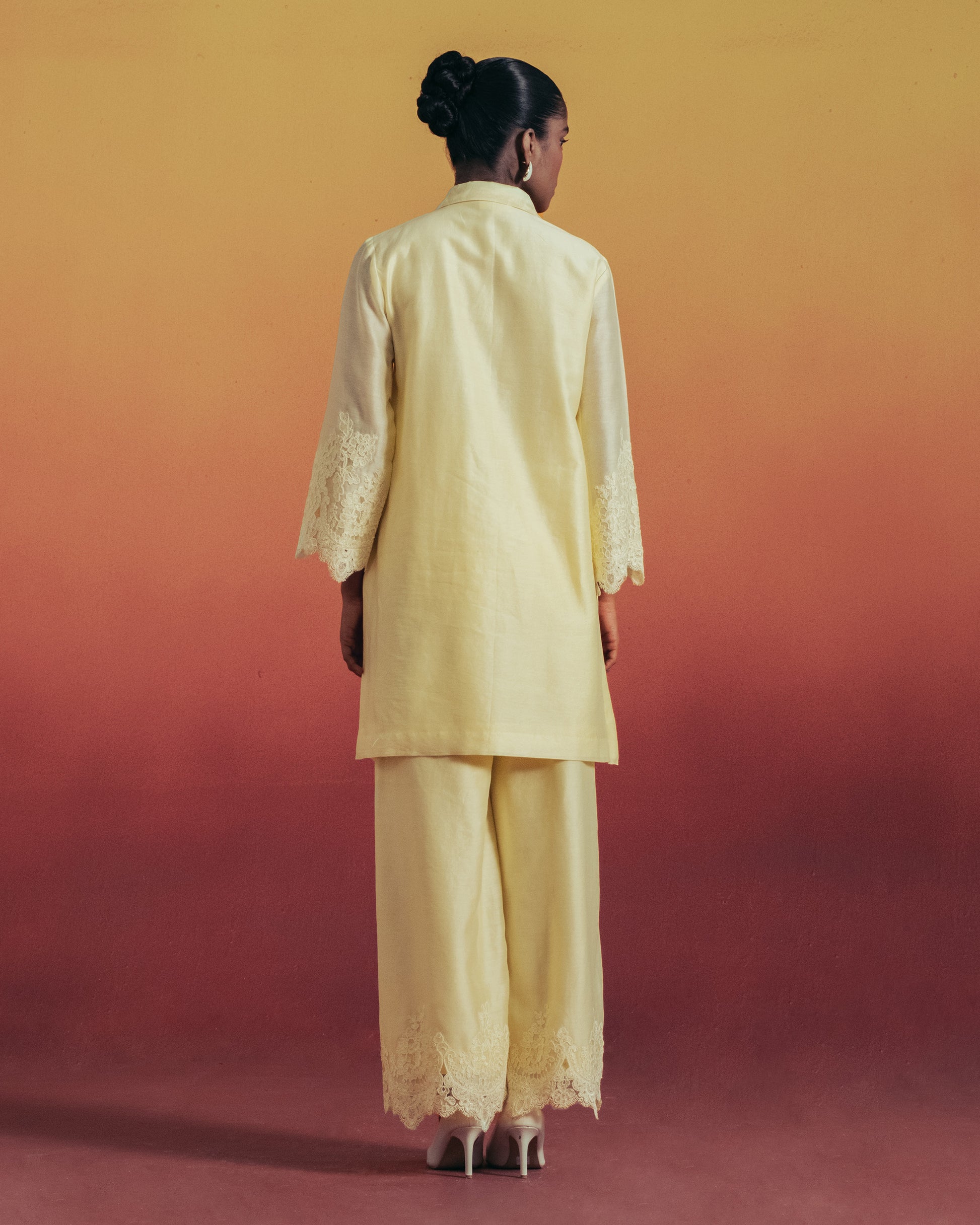 A soft butter-yellow tunic with delicate lace detailing, paired with relaxed trousers finished with lace hems. Light, graceful, and perfect for effortless summer elegance.