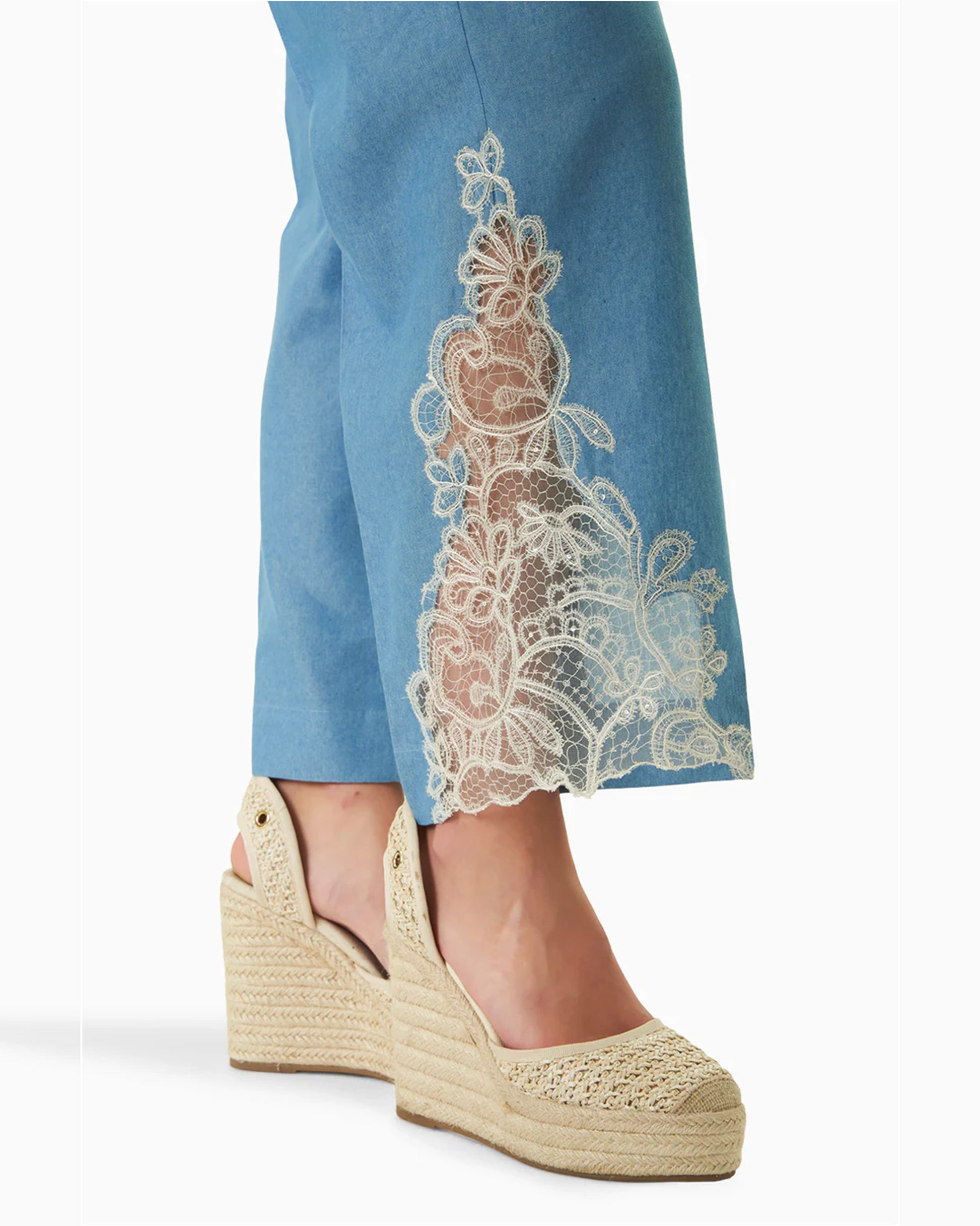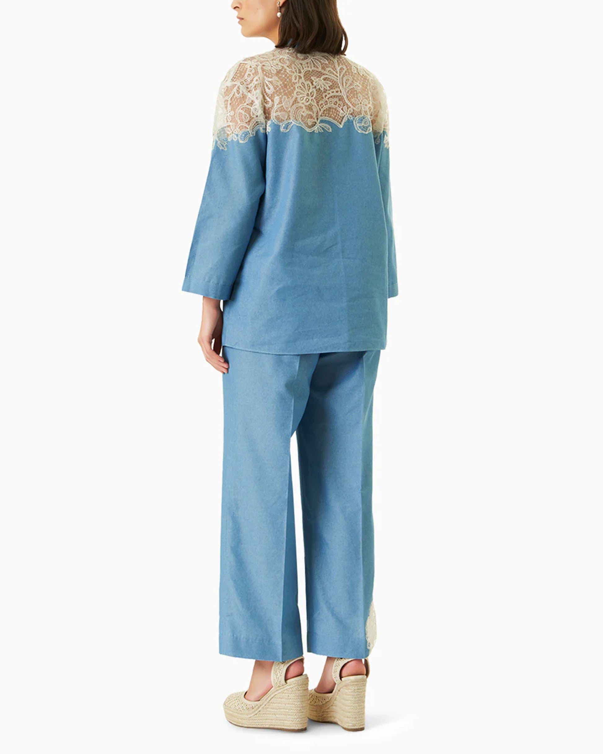 Fabric- Cotton Denim Color- Blue Embroidery- Lace Embroidery Fit- Straight Fit Components- 2 Product Code- SVETRISWF305