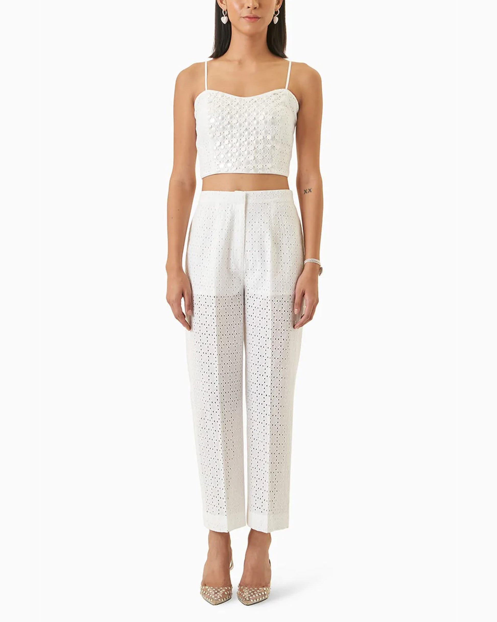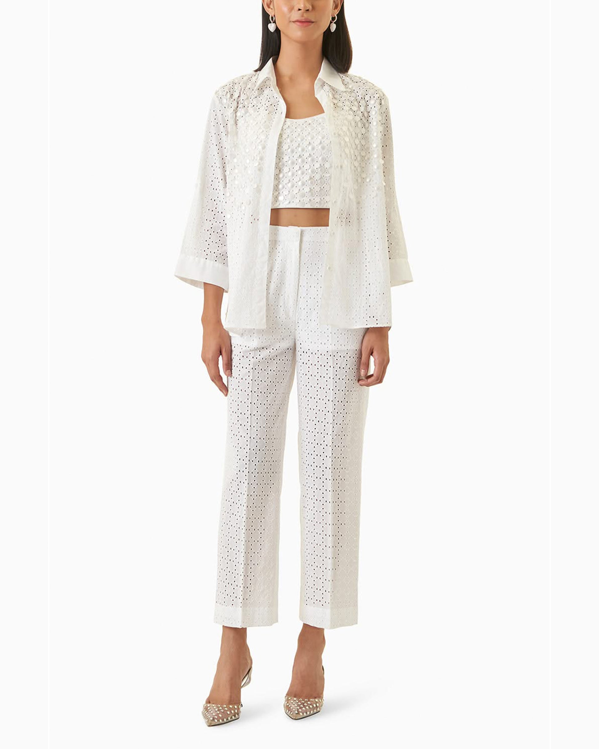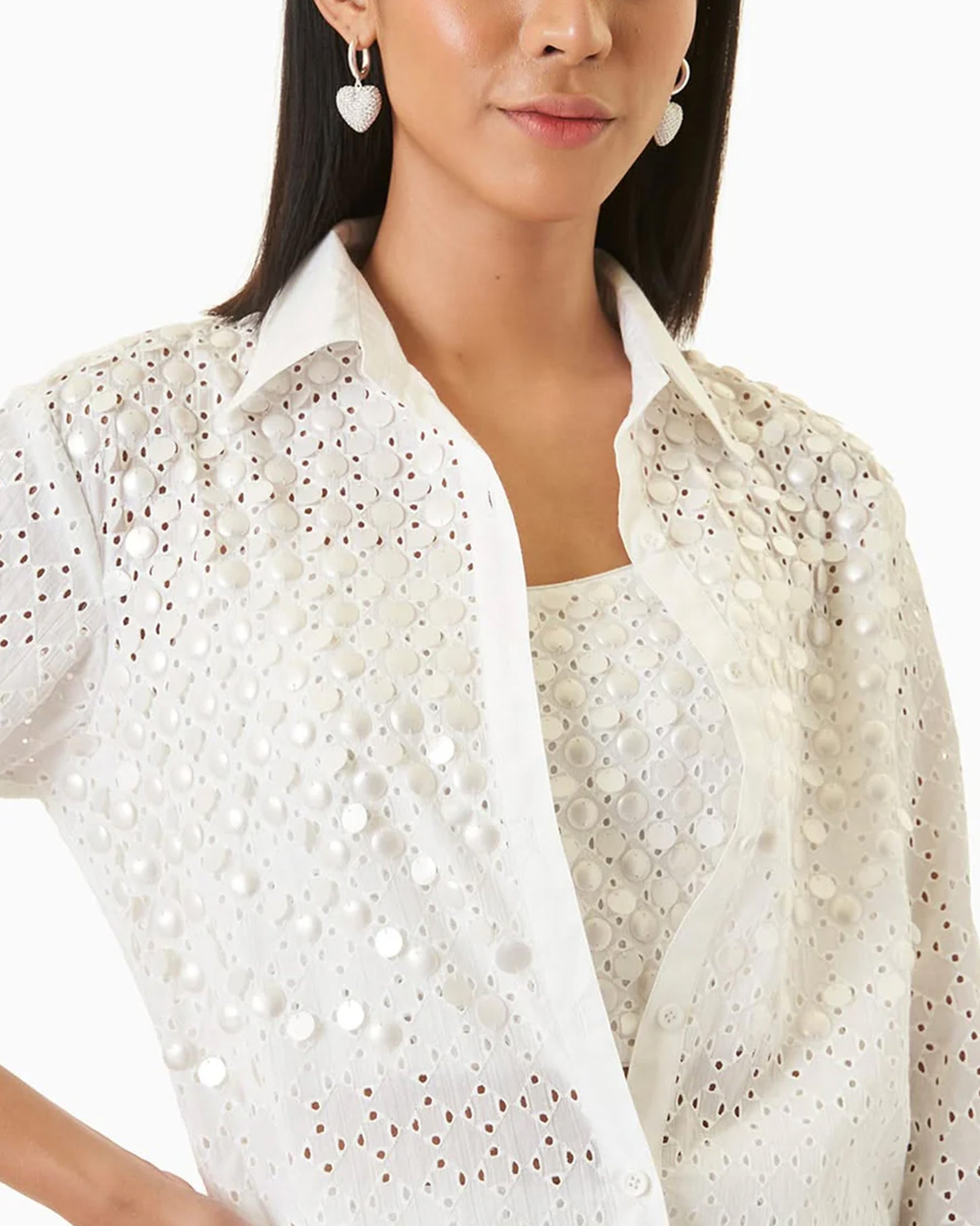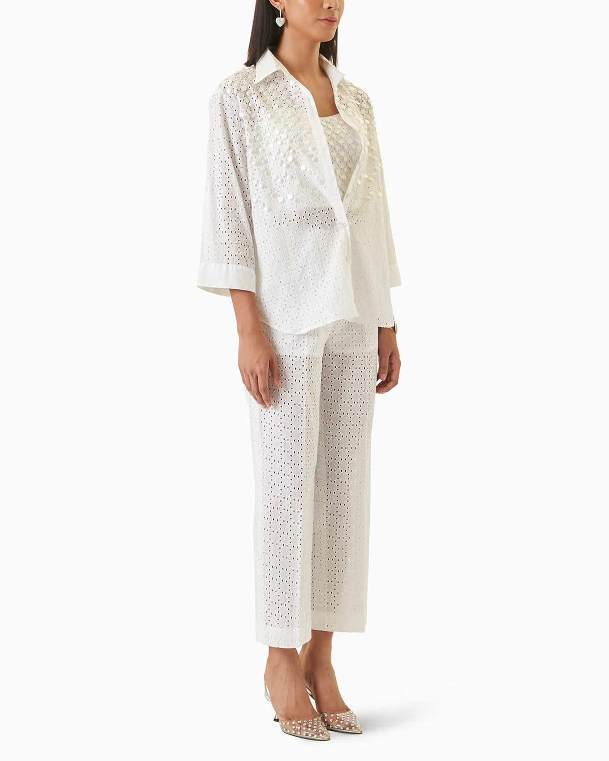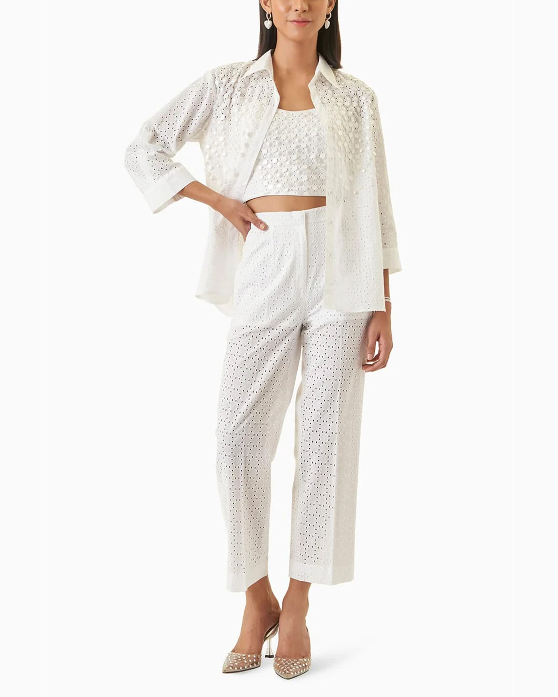 Featuring the Clam Set, crafted from cotton eyelet fabric. This chic ensemble showcases exquisite sequinned embroidery, adding a touch of sparkle and sophistication to your look.