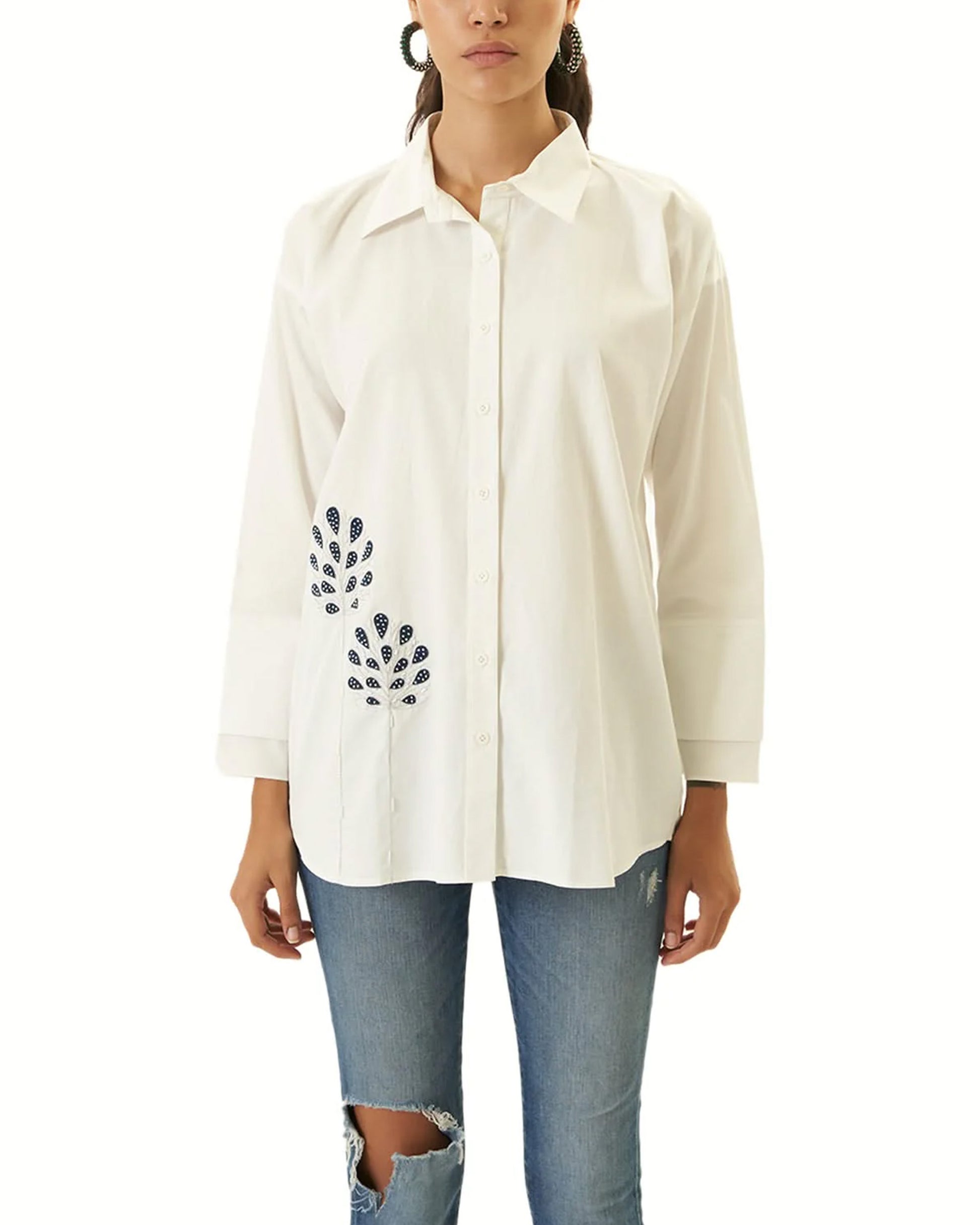 Featuring a denim white shirt with an embroidered floral motif. Tailored in 100% cotton with denim patch embroidery and cutdana detailing.