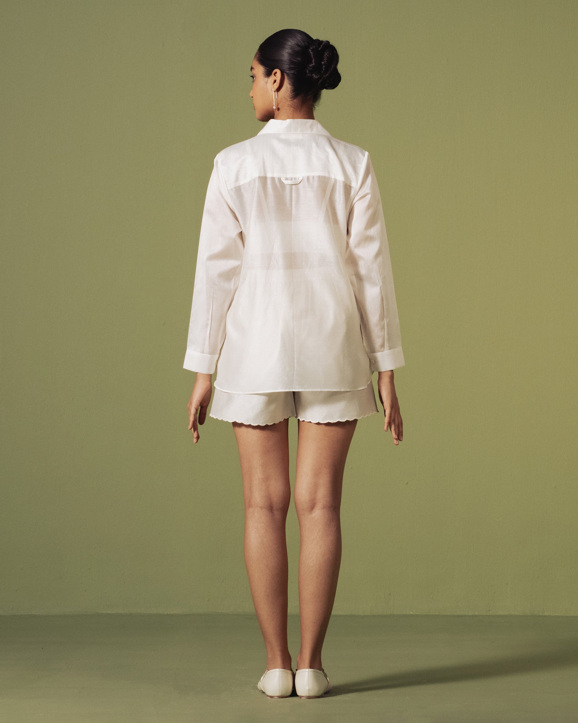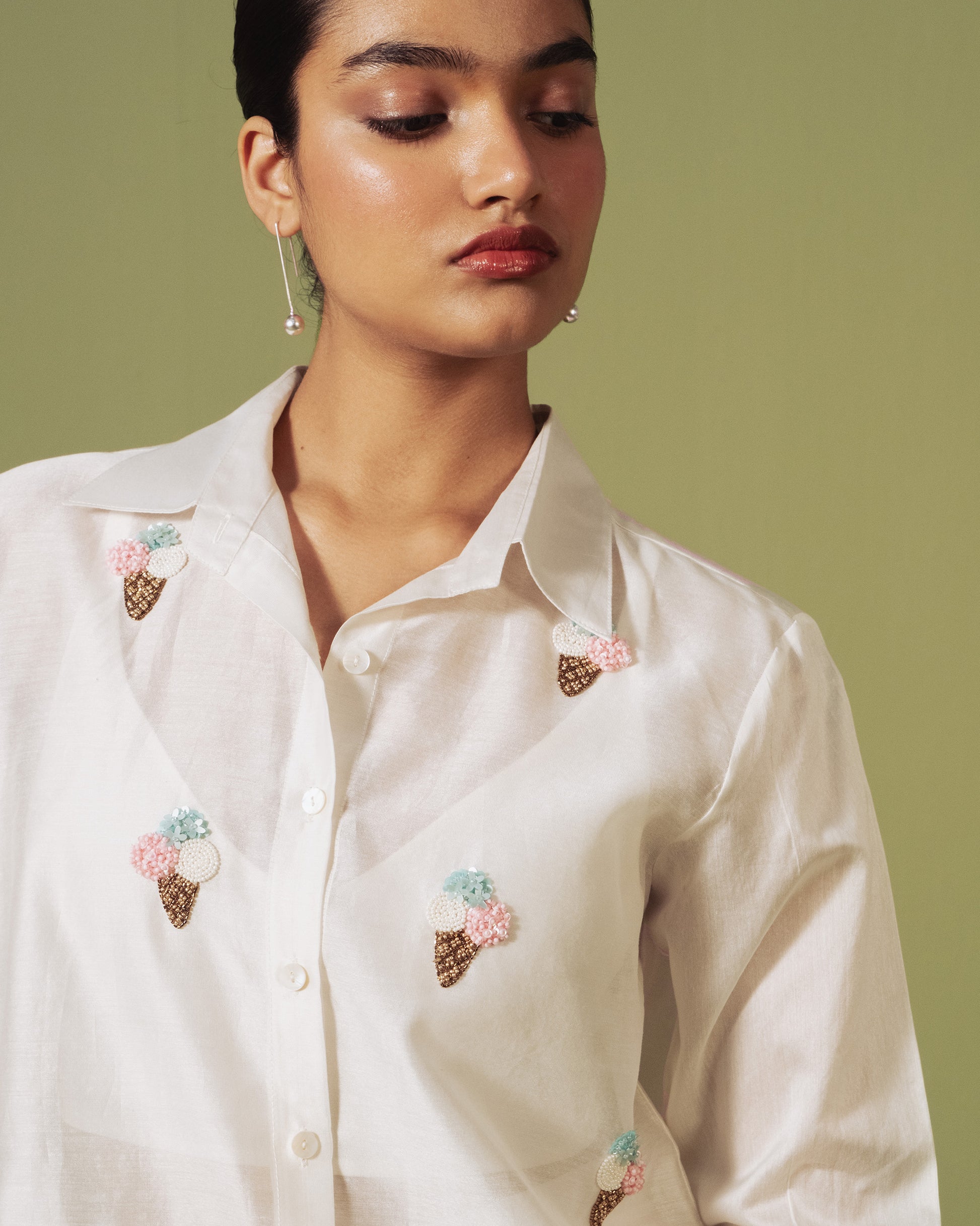 A breezy ivory shirt adorned with playful ice-cream embroidery, paired with scalloped shorts. Light, whimsical, and perfect for sunny summer days.