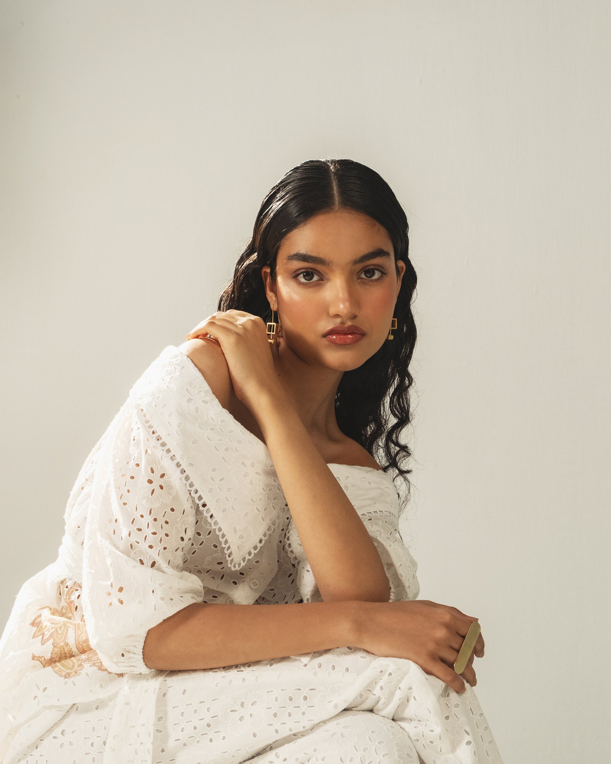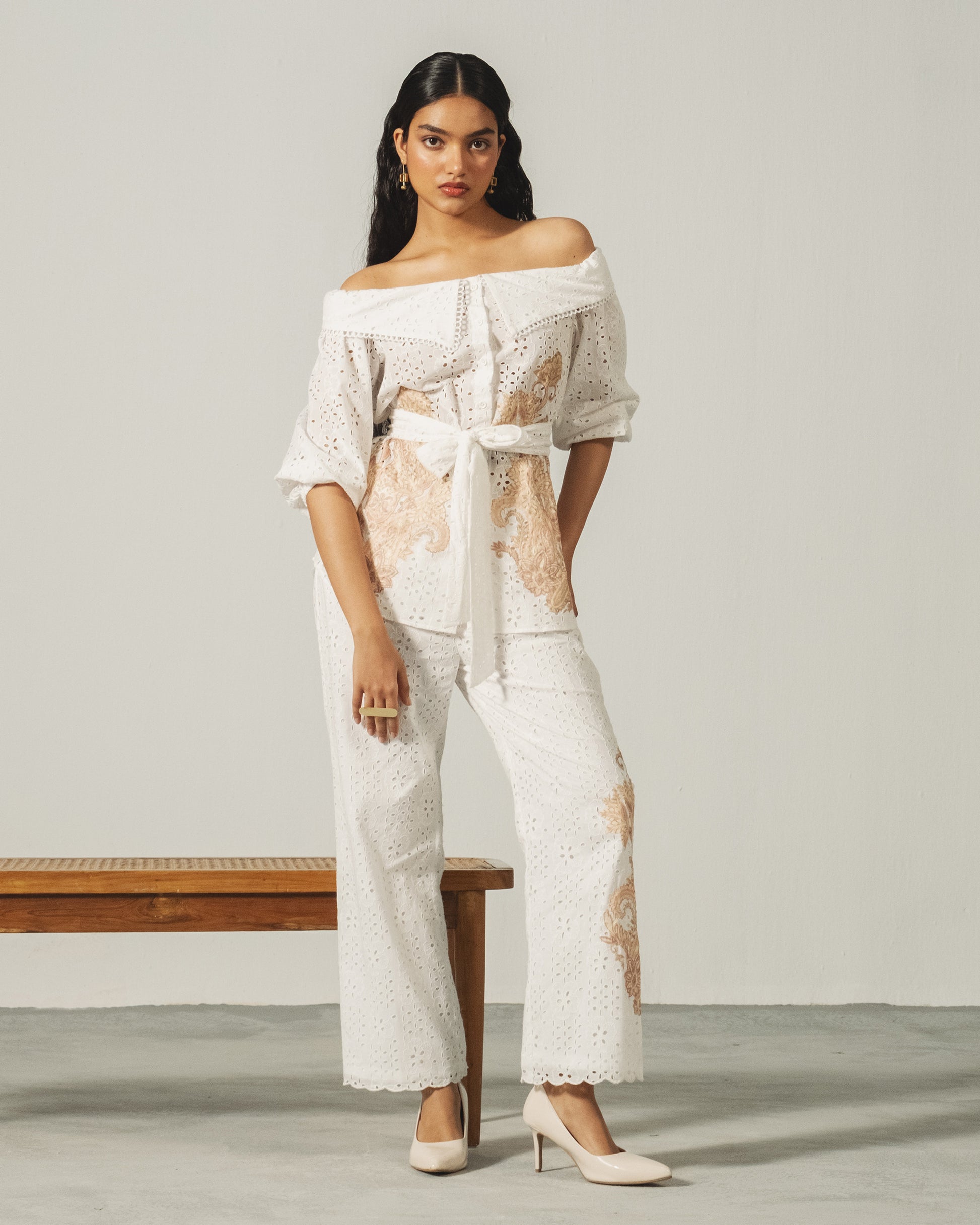 An off-shoulder eyelet co-ord with soft paisley accents and a waist tie for a flattering silhouette. Light, feminine, and perfect for relaxed summer days.
