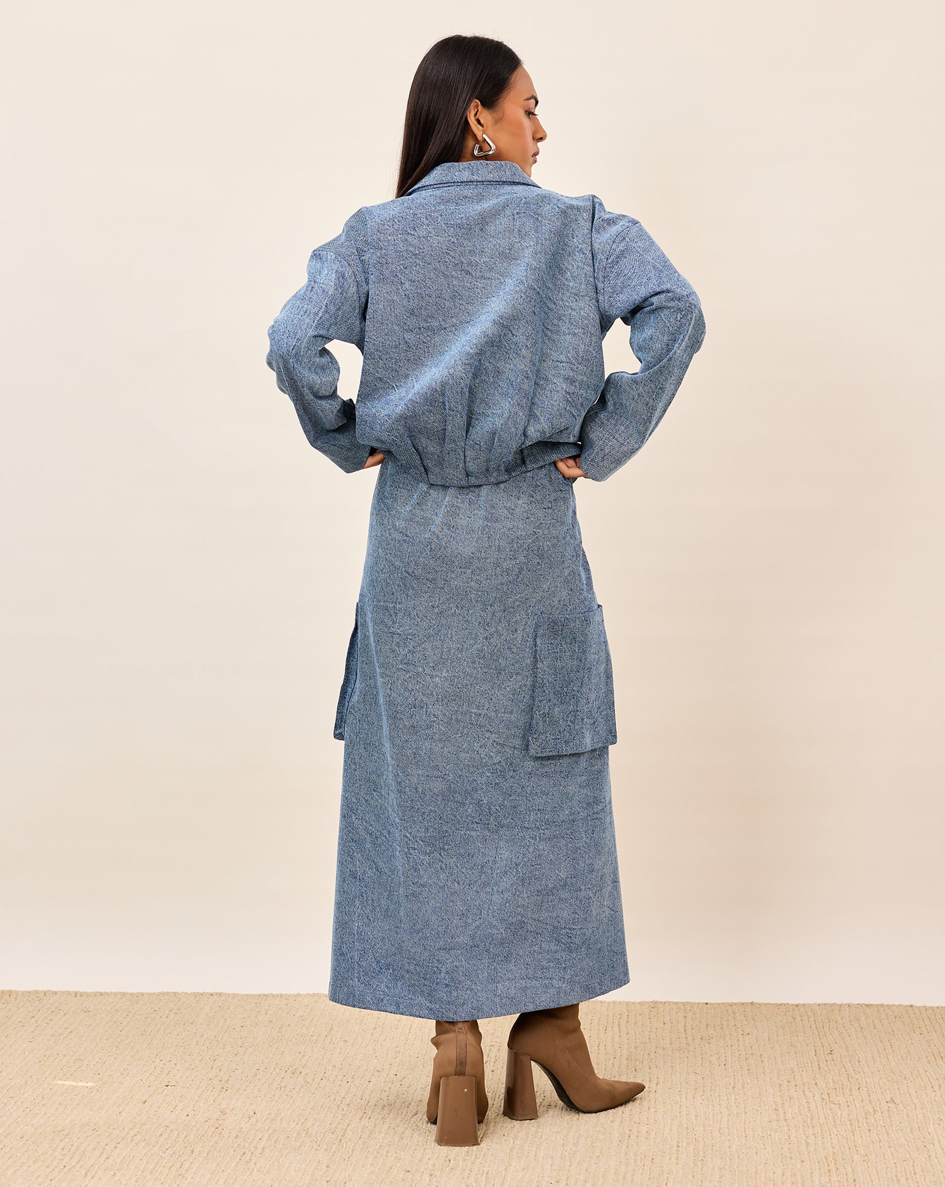 A modern blue coord set crafted in a textured denim. the top showcases relaxed sleeves and gentle pleated detailing , paired with a matching midi skirt with clean lines and side pocket accents.