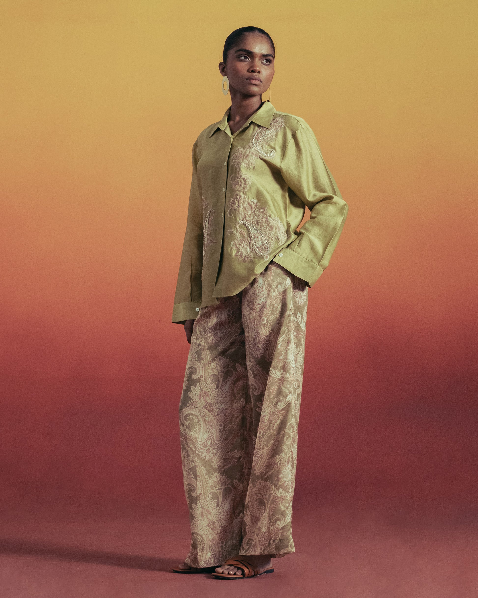 An olive shirt adorned with delicate paisley embroidery, paired with flowing printed trousers. Earthy, elegant, and effortlessly relaxed for summer.