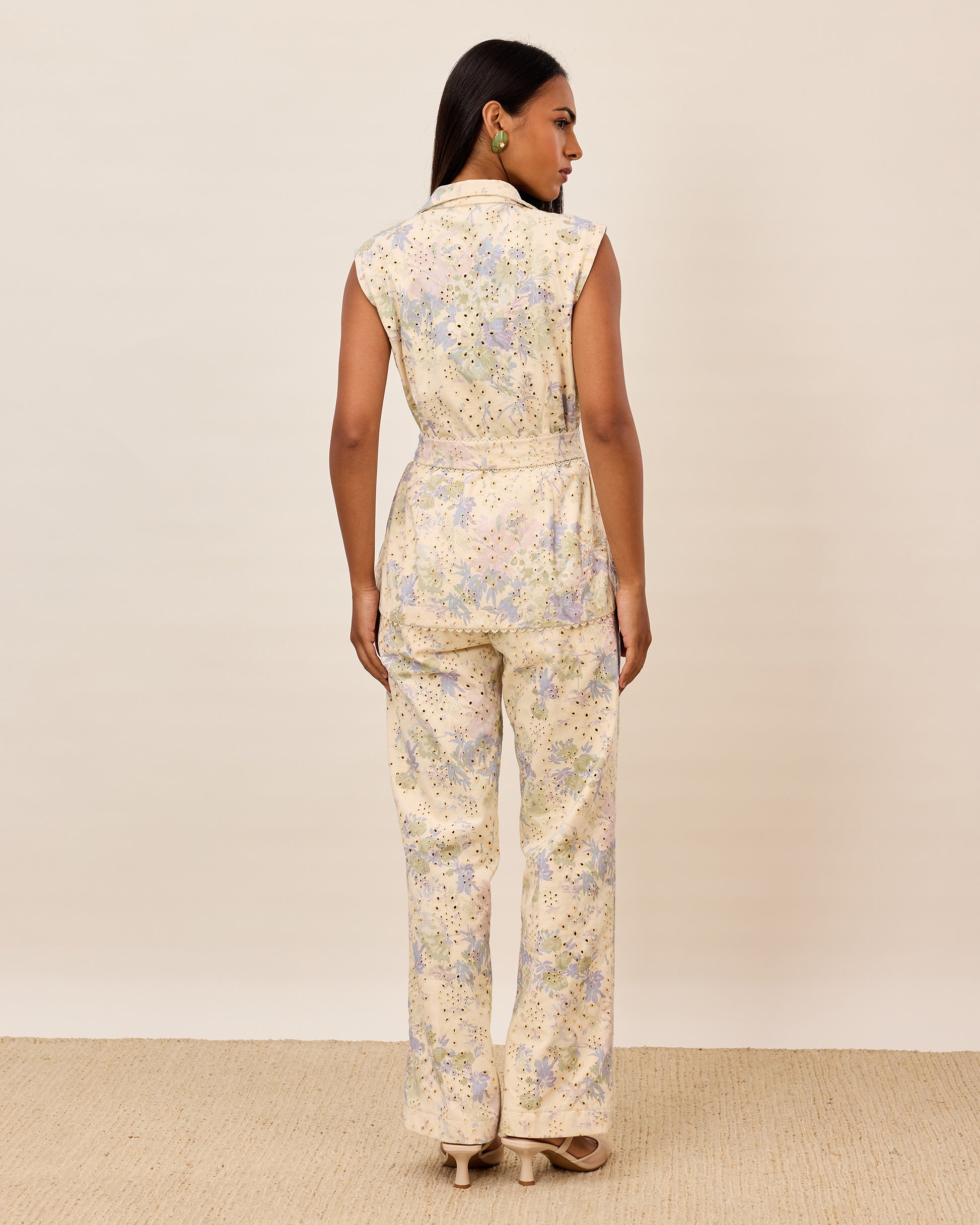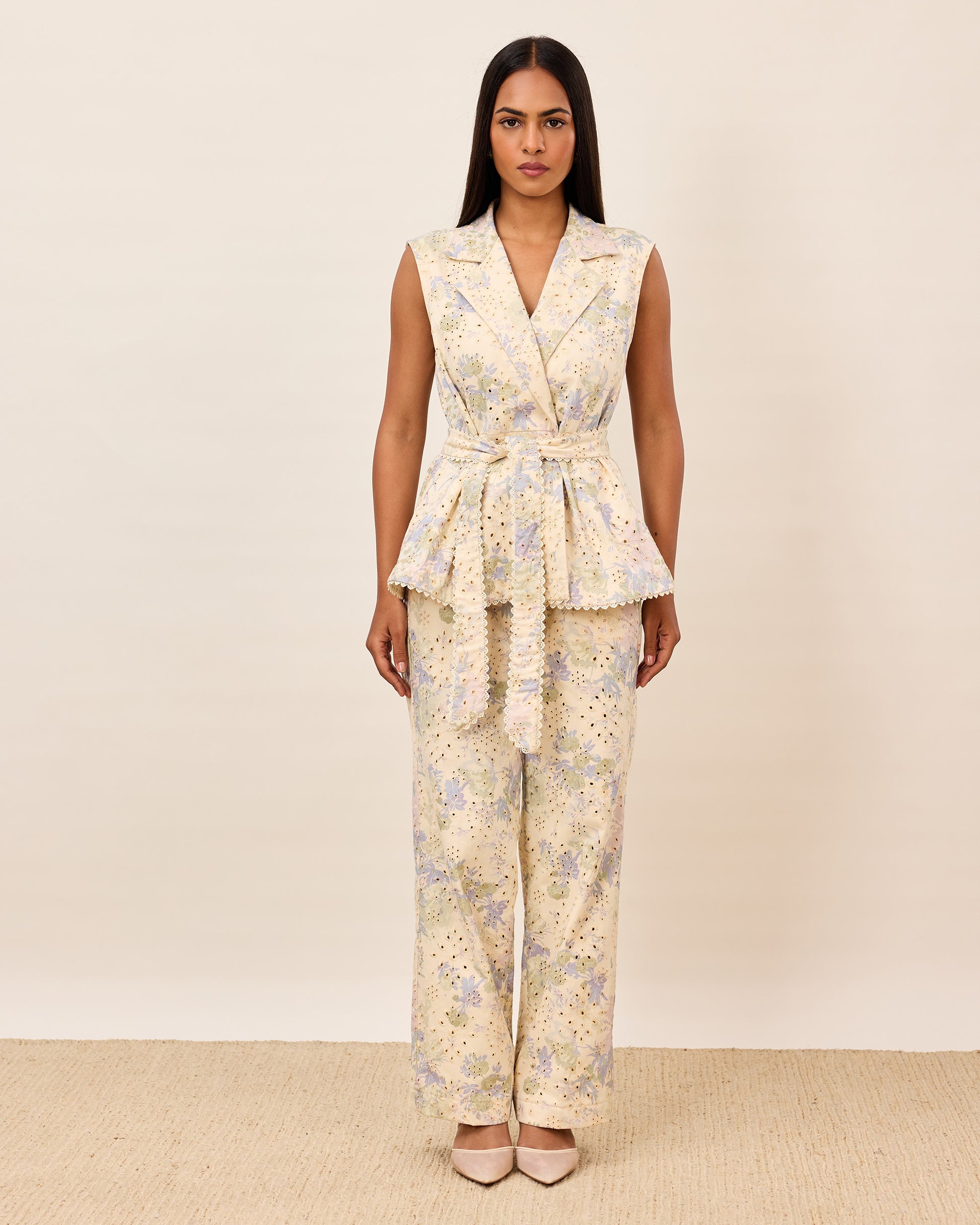 Soft ivory floral cutwork coord set with tailored peplum top and straight trousers .