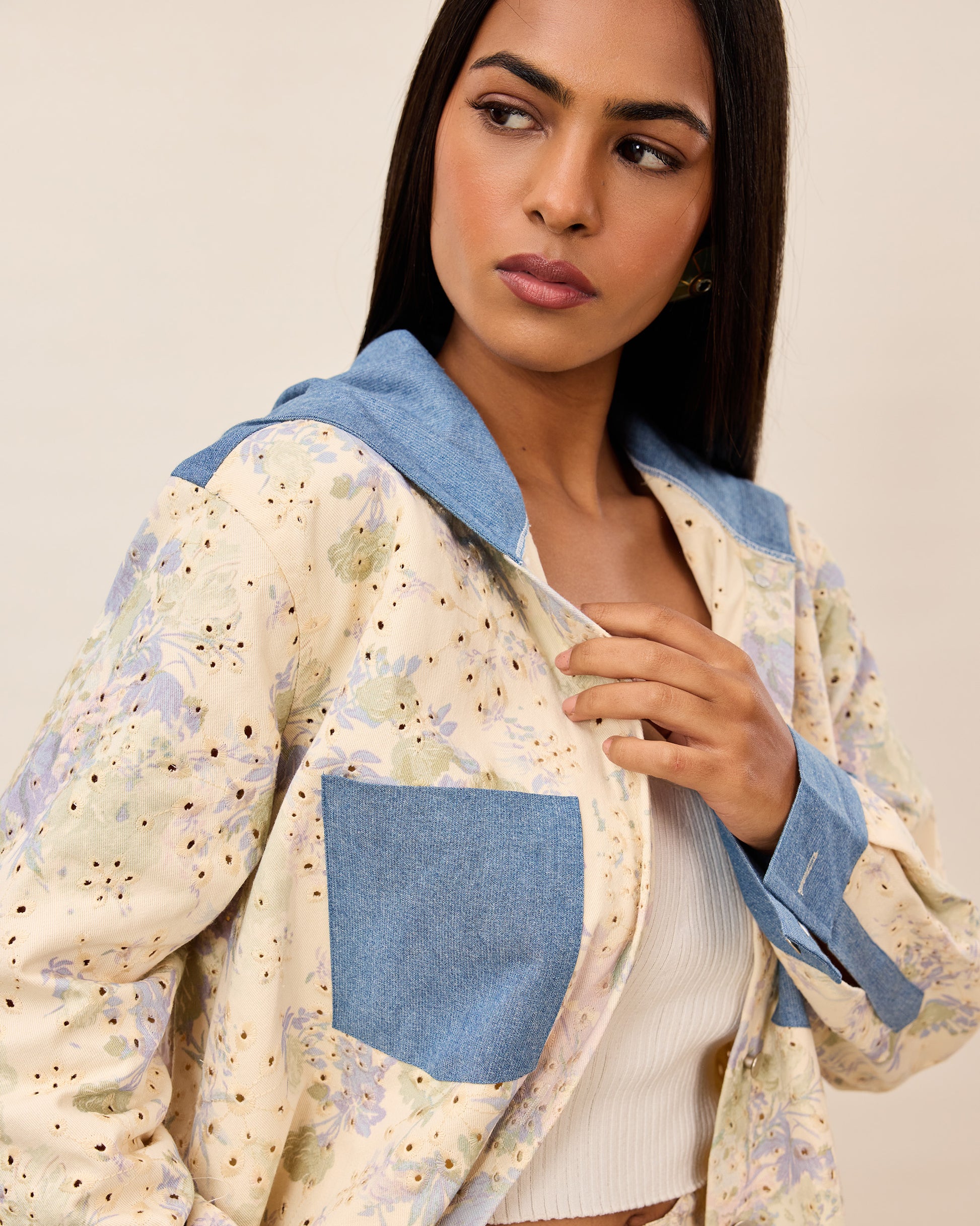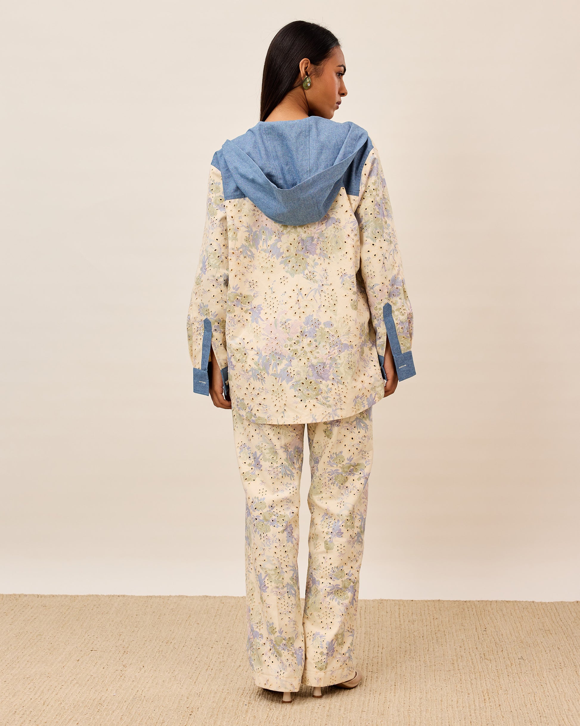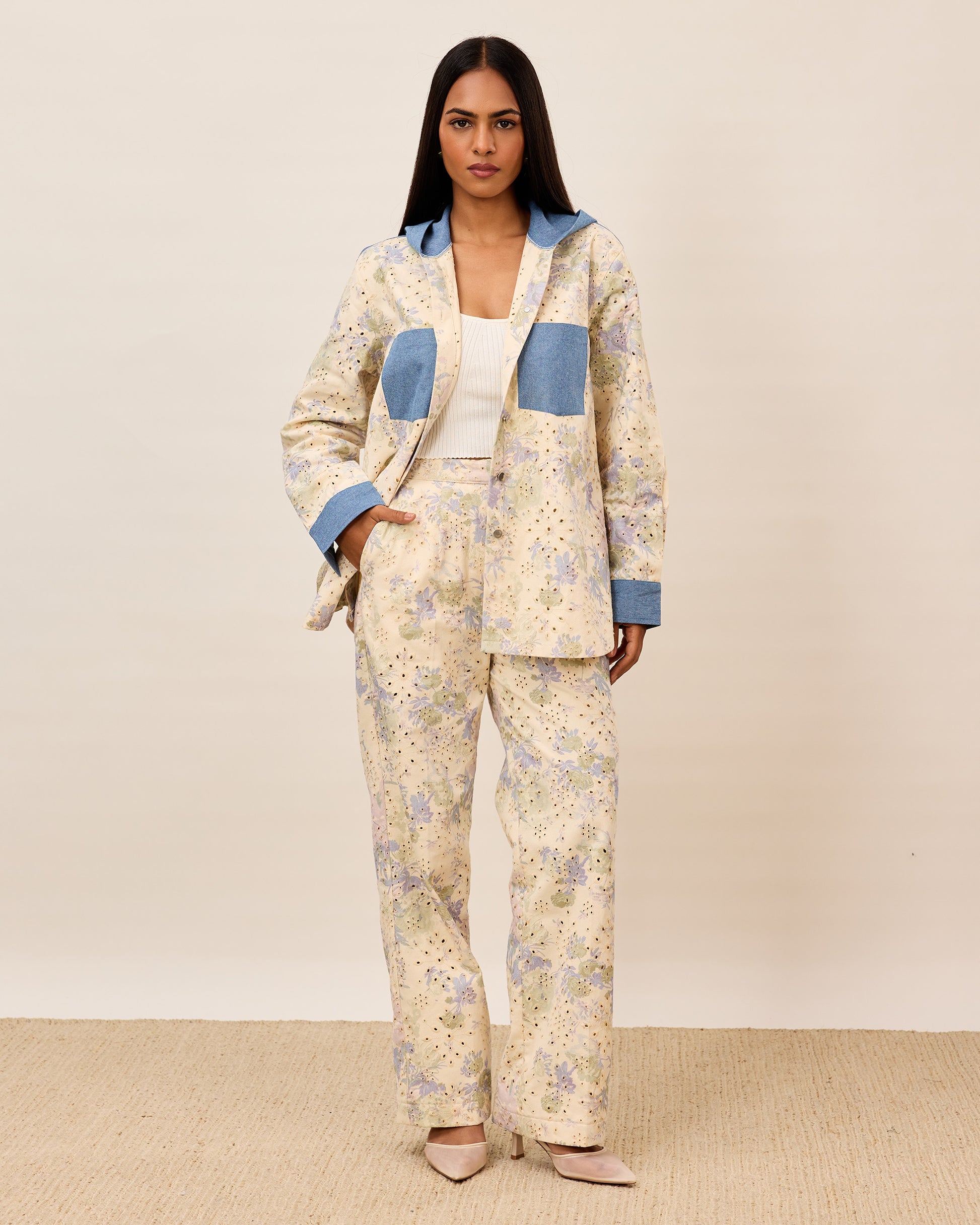 Pastel printed eyelet coord set featuring a relaxed button down jacket with denim patch pockets and cuffs, paired with matching pants