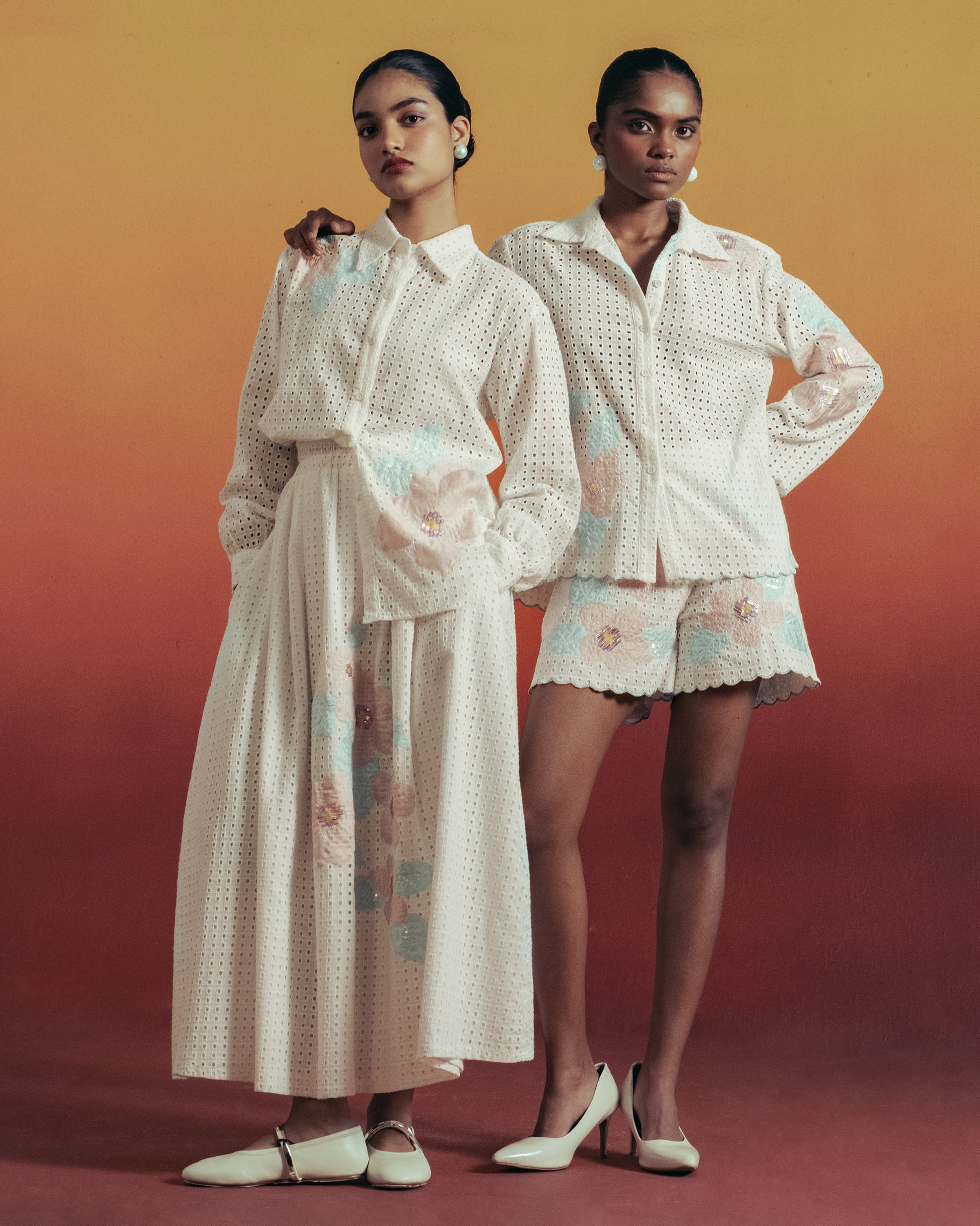 A breezy eyelet shirt paired with a flowing skirt, adorned with soft pastel floral embroidery. Feminine, airy, and perfect for sunlit summer days.