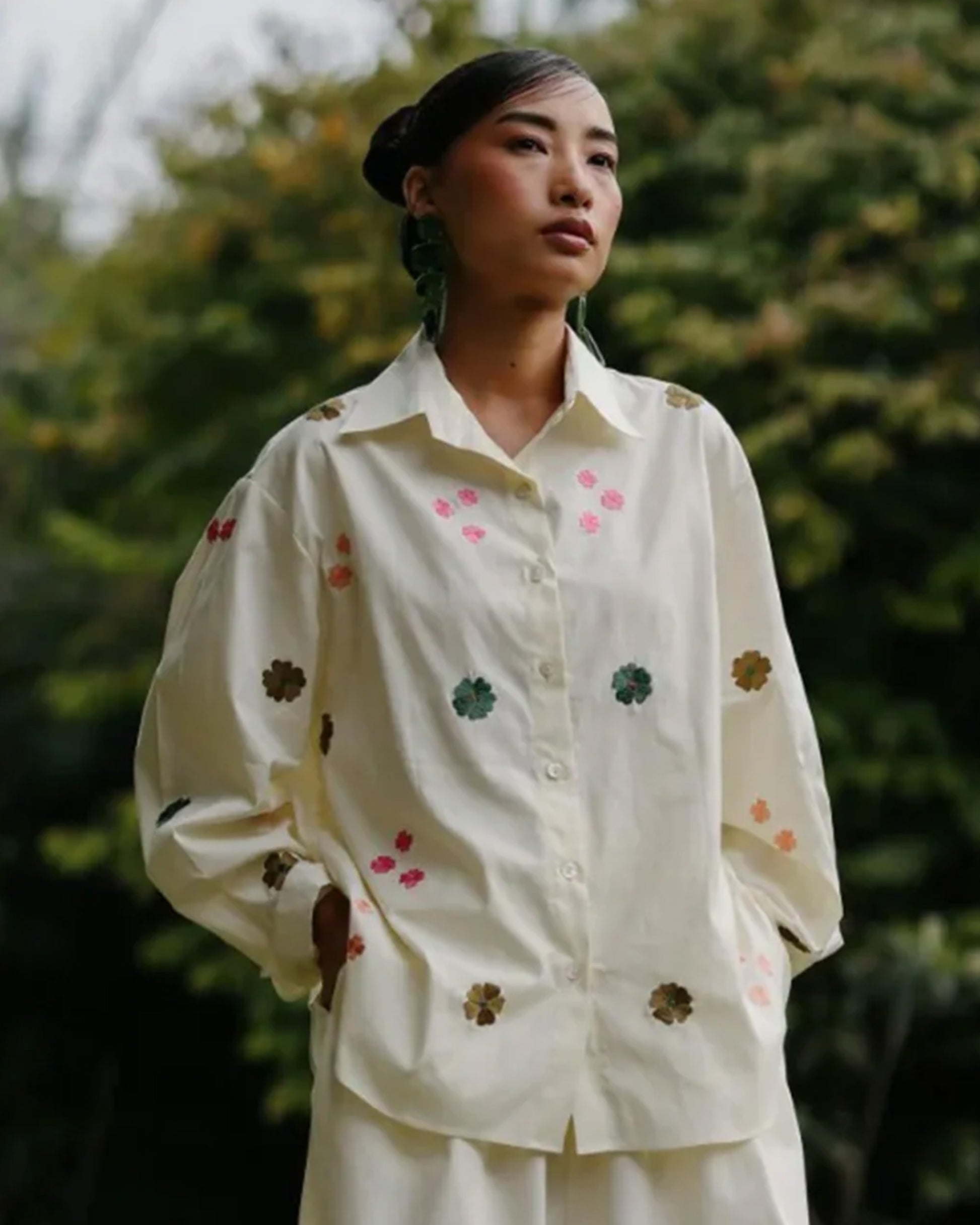 Effortlessly stylish the Pop-Dot Cotton Shirt is perfect for relaxed days. Crafted from soft, breathable cotton in a subtle off-white/cream tone, it’s finished with delicate floral thread embroidery for a charming touch.