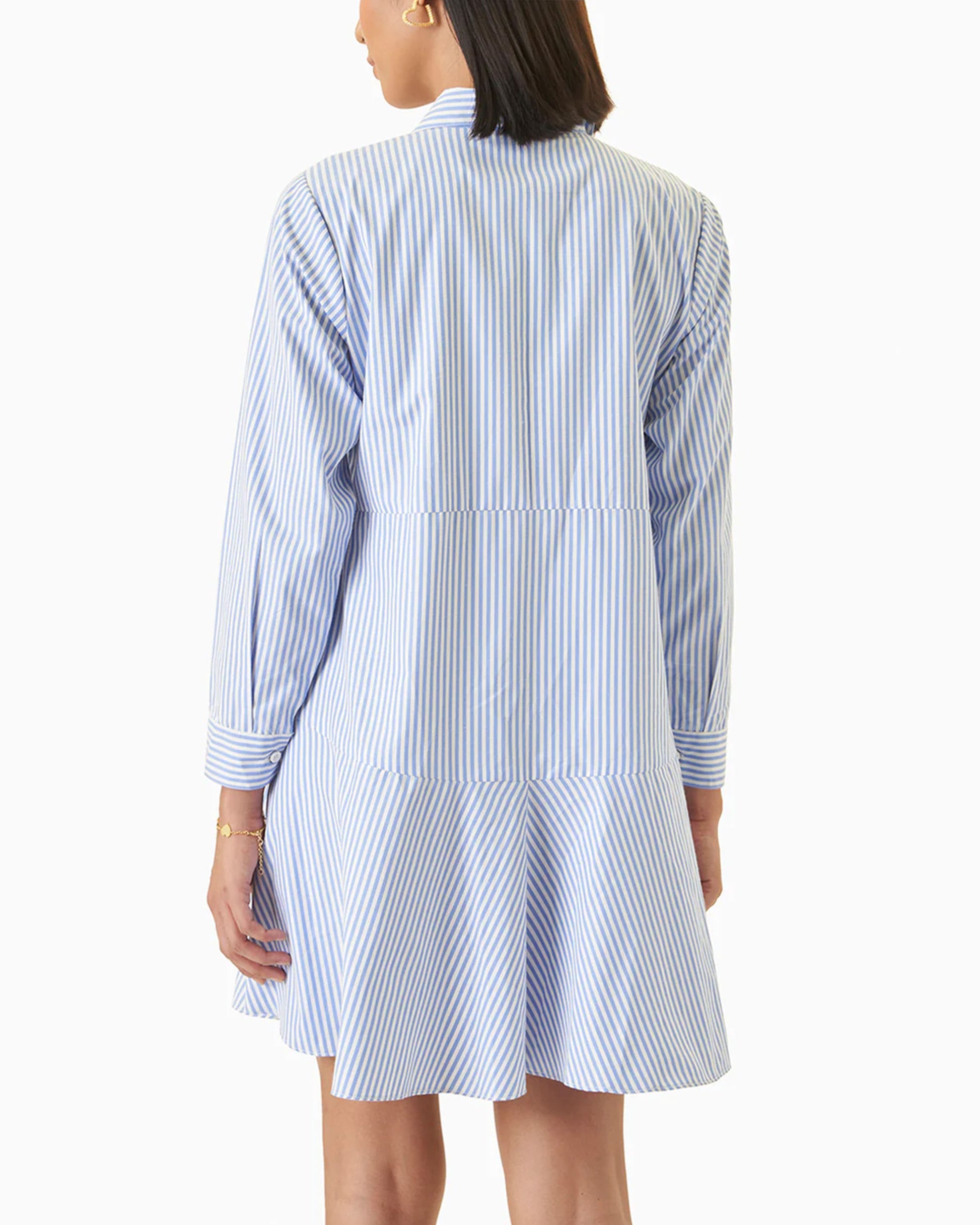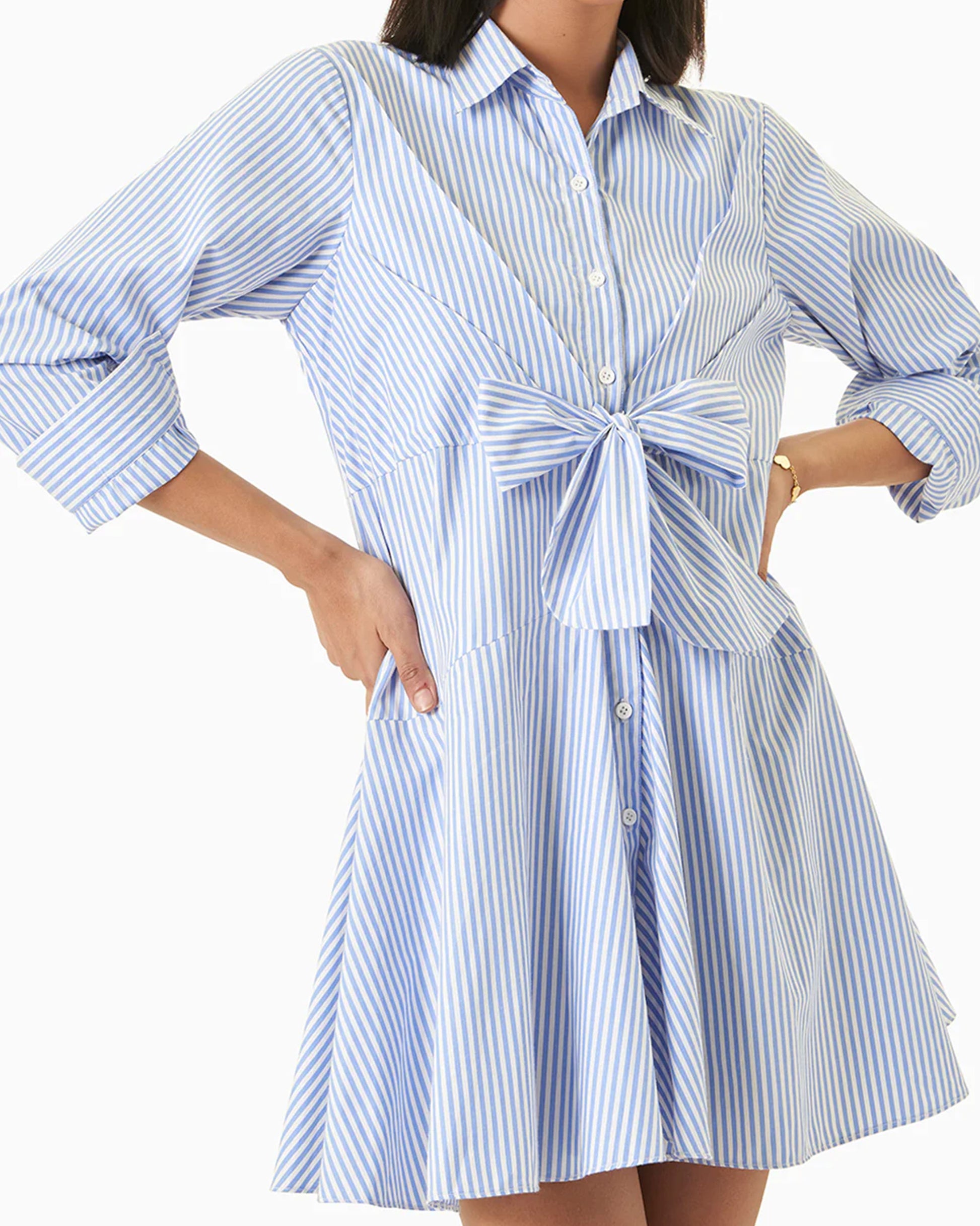 Featuring the Rachel Skater Dress, crafted from striped cotton for a chic and comfortable look. This stylish dress showcases a unique knotted design, perfect for a playful yet sophisticated ensemble.