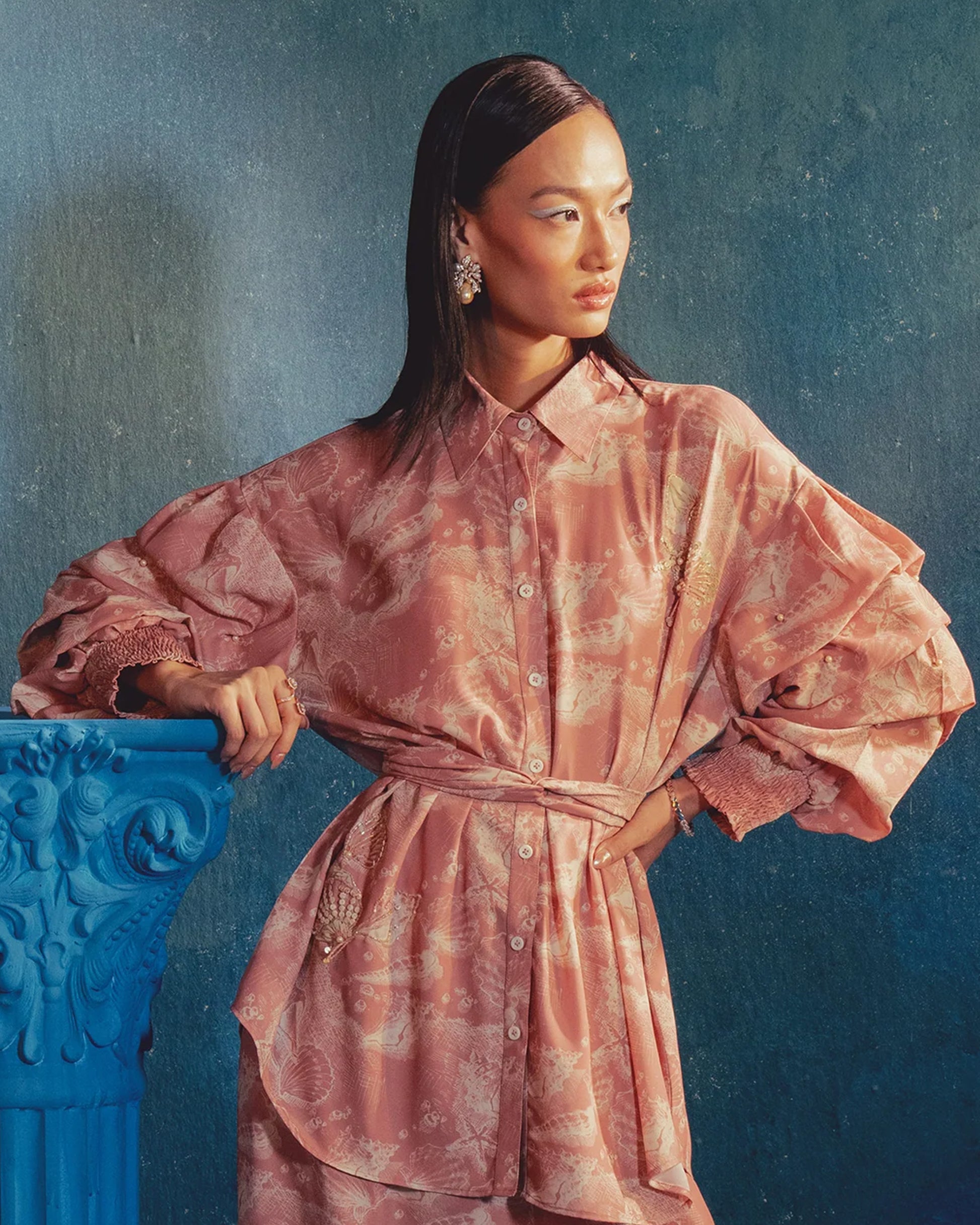 Comfort meets confidence in the Trisara Sea Shell Shirt. This loose-fitting georgette shirt boasts delicate embroidery and flouncy sleeves that turn heads, all in a soft pink hue.