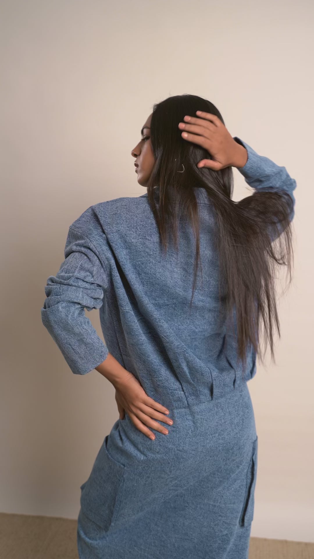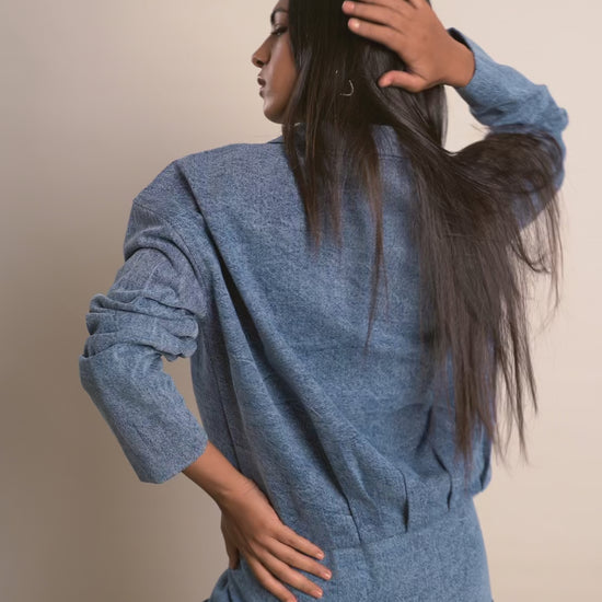 Sky blue denim coord set featuring a relaxed fit jacket and matching straight cut pants ,adorned with delicate white floral embroidery