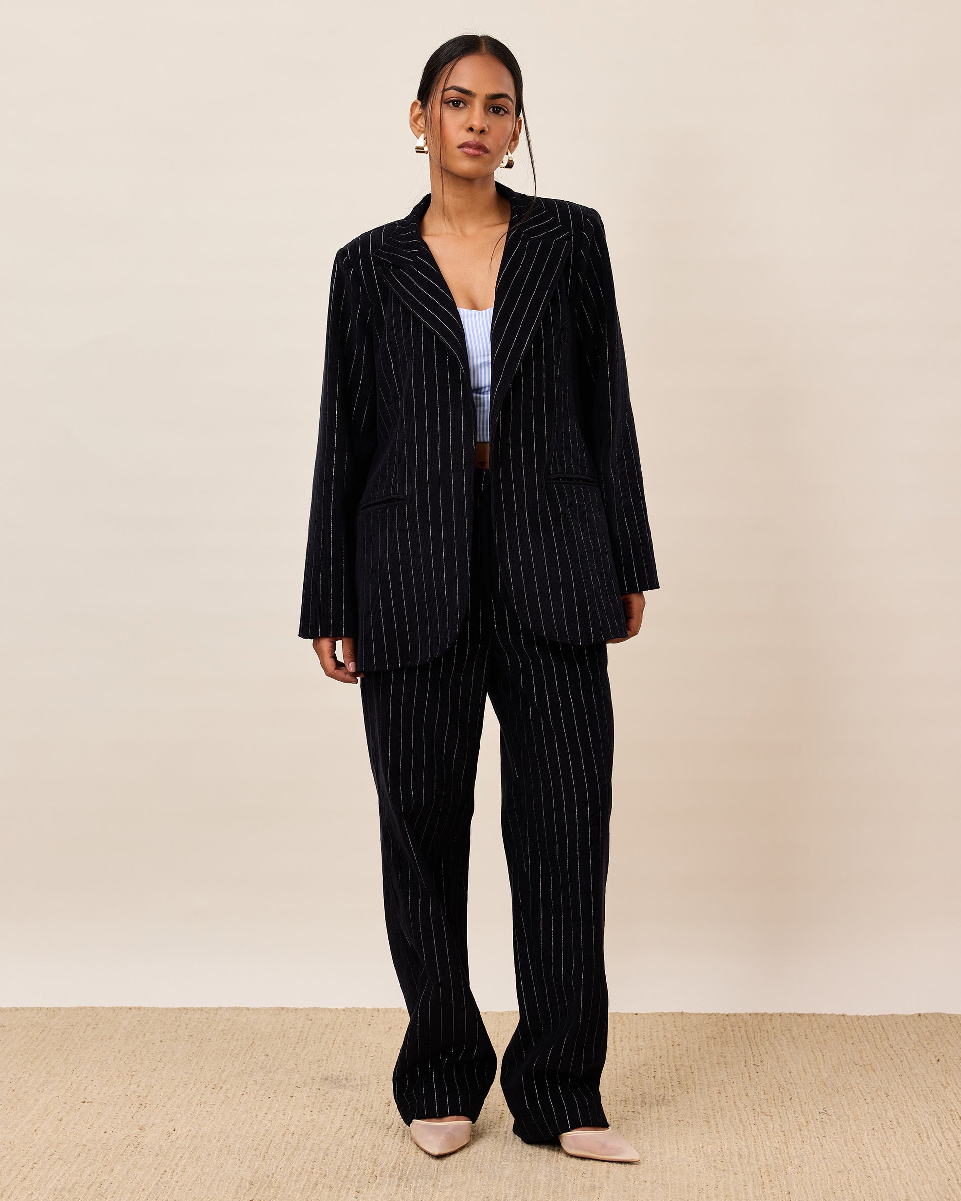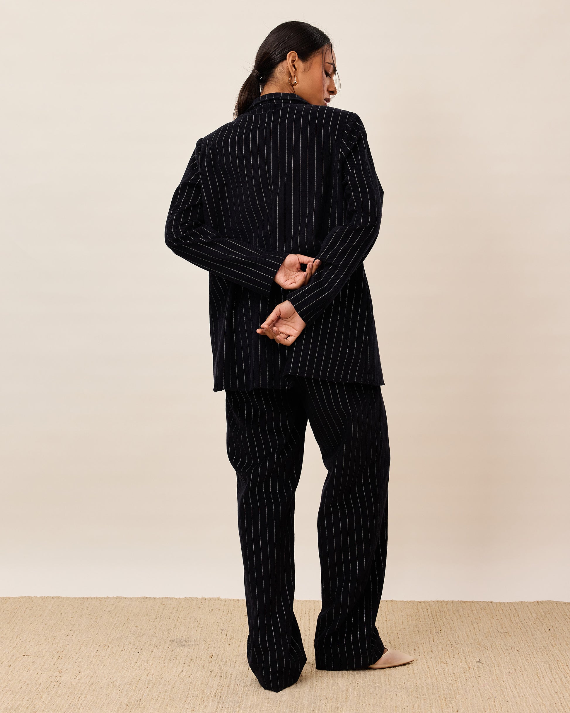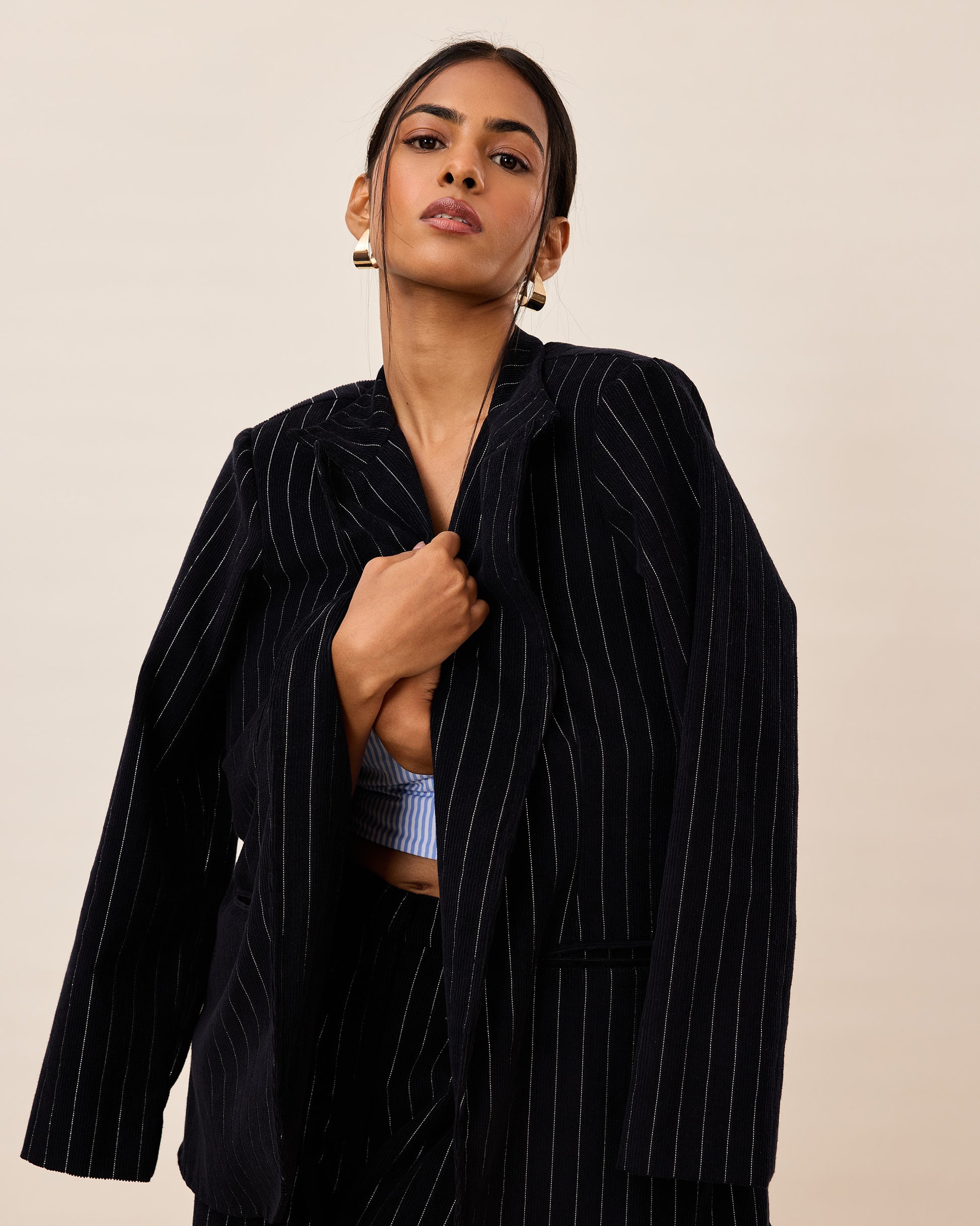 This corduroy pant suit features a relaxed-fit blazer with subtle vertical stripes and matching wide leg trousers