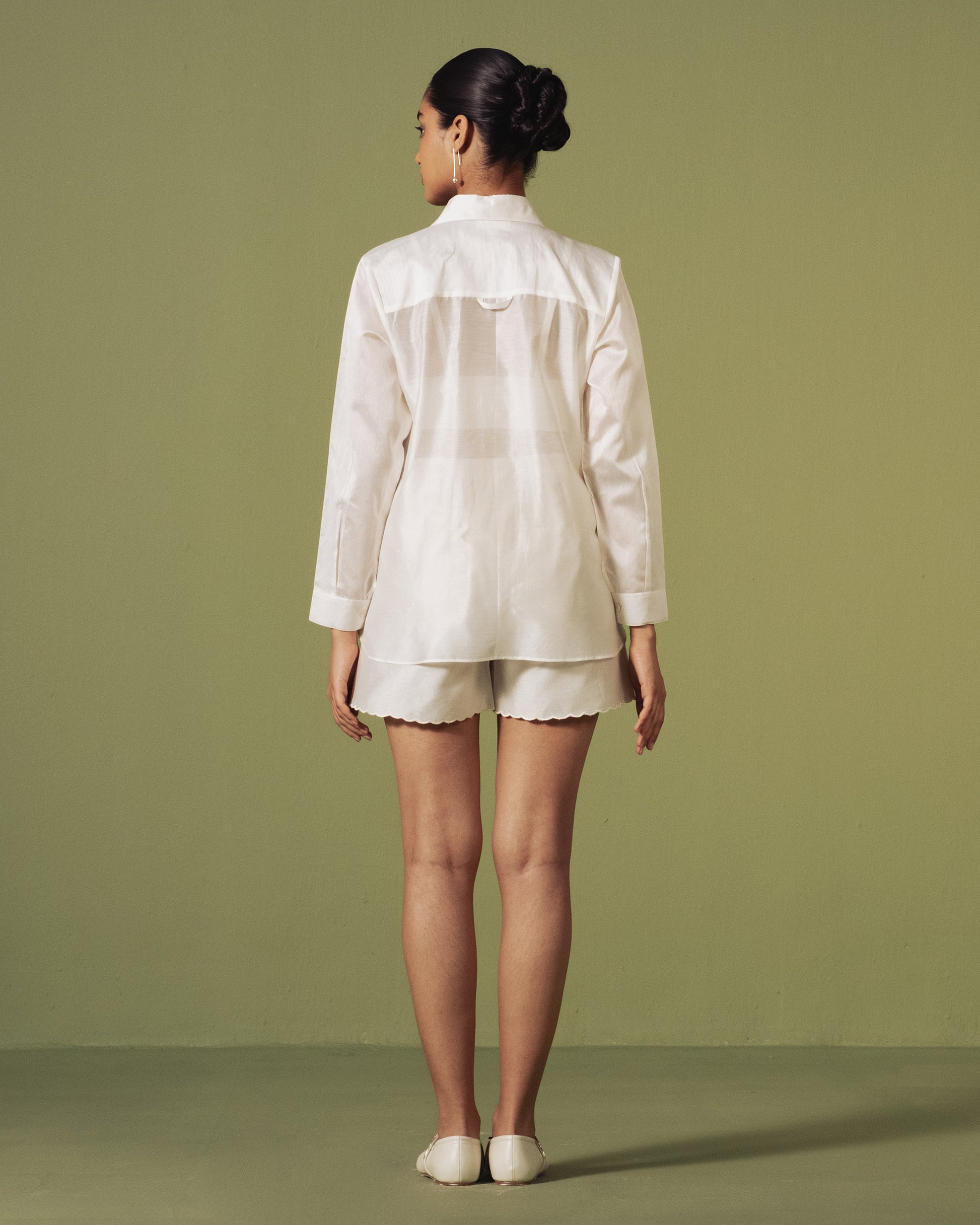 A playful ivory shirt adorned with charming popcorn embroidery, paired with scalloped shorts. Lighthearted, fun, and perfect for carefree summer days.